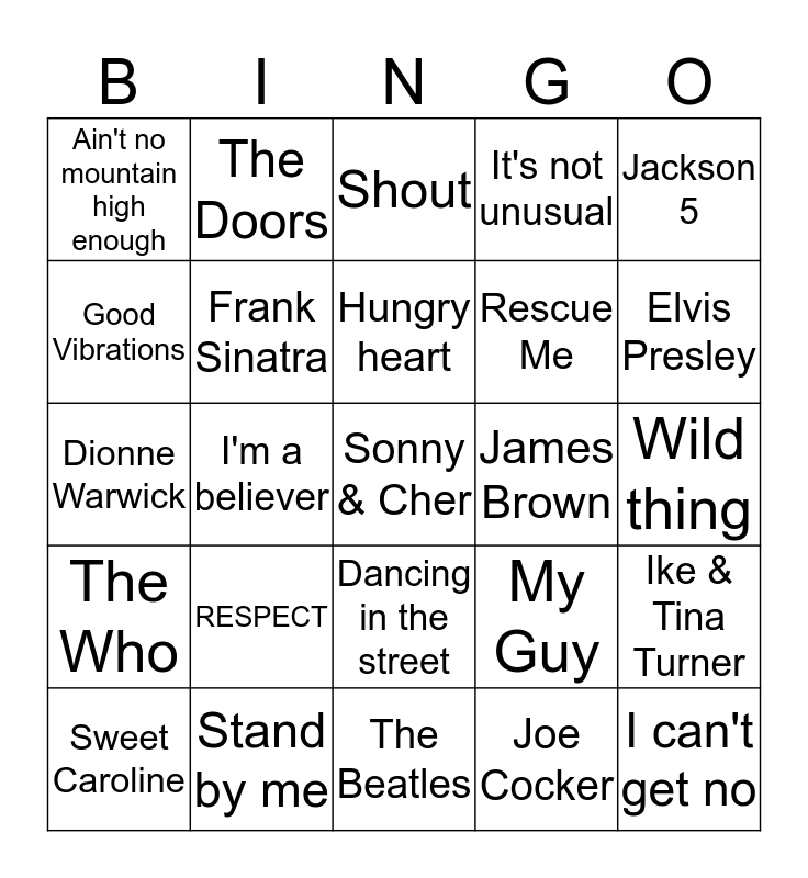This bingo card has 25 words: RESPECT, The Beatles, Hungry heart, Sweet Caroline, Jackson 5, Ain't no mountain high enough, Good Vibrations, The Doors, James Brown, Dancing in the street, Rescue Me, Dionne Warwick, My Guy, Ike & Tina Turner, Frank Sinatra, I can't get no, Wild thing, Shout, Elvis Presley, I'm a believer, Sonny & Cher, Stand by me, The Who, It's not unusual and Joe Cocker.
