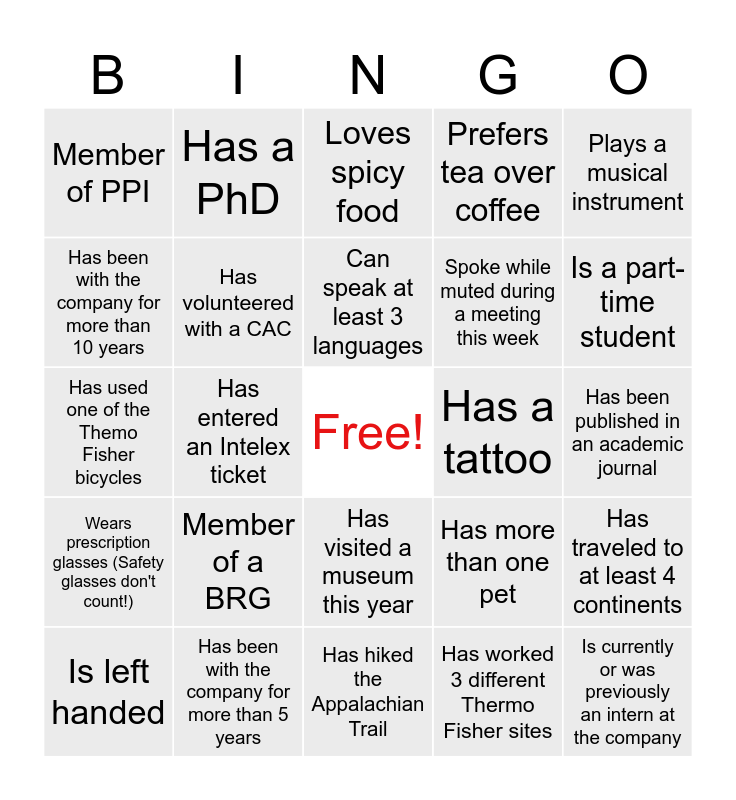 This bingo card has a free space and 24 words: Member of a BRG, Has been with the company for more than 5 years, Can speak at least 3 languages, Is left handed, Plays a musical instrument, Member of PPI, Has been with the company for more than 10 years, Has a PhD, Has a tattoo, Has visited a museum this year, Spoke while muted during a meeting this week, Has used one of the Themo Fisher bicycles, Has more than one pet, Has traveled to at least 4 continents, Has volunteered with a CAC, Has worked 3 different Thermo Fisher sites, Has been published in an academic journal, Loves spicy food, Is a part-time student, Has entered an Intelex ticket, Is currently or was previously an intern at the company, Wears prescription glasses (Safety glasses don't count!), Prefers tea over coffee and Has hiked the Appalachian Trail.