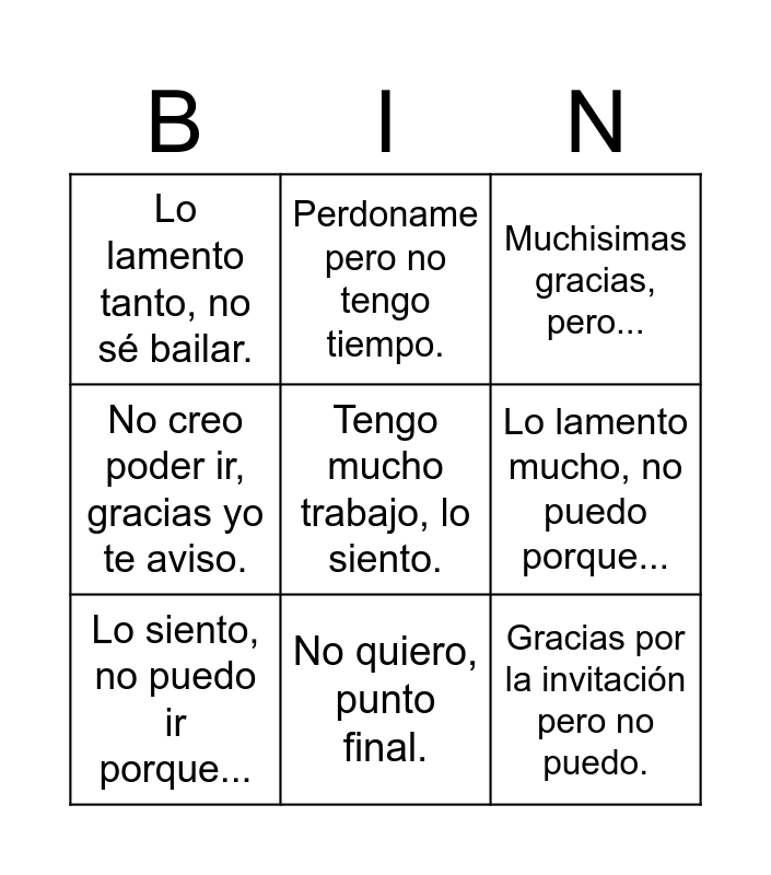 This bingo card has a free space and 8 words: Lo lamento mucho, no puedo porque..., Muchisimas gracias, pero..., Perdoname pero no tengo tiempo., Lo siento, no puedo ir porque..., Lo lamento tanto, no sé bailar., Gracias por la invitación pero no puedo., No creo poder ir, gracias yo te aviso. and No quiero, punto final..