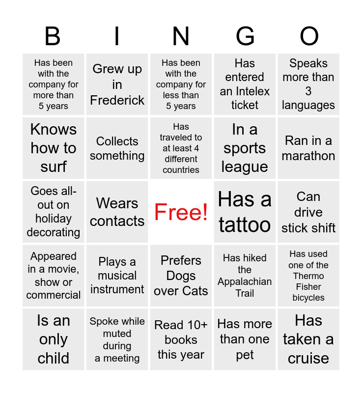 This bingo card has a free space and 24 words: Plays a musical instrument, Spoke while muted during a meeting, Has traveled to at least 4 different countries, Is an only child, Speaks more than 3 languages, Has been with the company for more than 5 years, Knows how to surf, Grew up in Frederick, Has a tattoo, Prefers Dogs over Cats, In a sports league, Goes all-out on holiday decorating, Has hiked the Appalachian Trail, Has used one of the Thermo Fisher bicycles, Collects something, Has more than one pet, Can drive stick shift, Has been with the company for less than 5 years, Ran in a marathon, Wears contacts, Has taken a cruise, Appeared in a movie, show or commercial, Has entered an Intelex ticket and Read 10+ books this year.