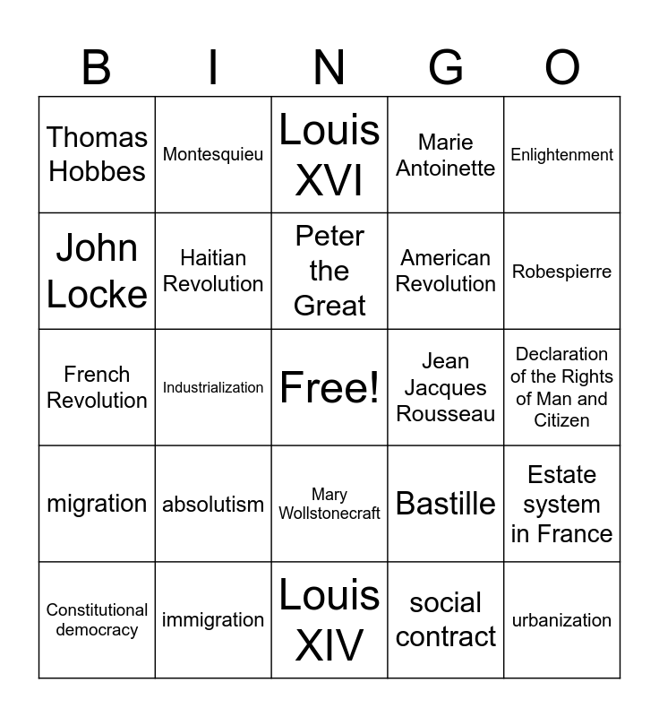 This bingo card has a free space and 25 words: absolutism, Louis XIV, Peter the Great, Constitutional democracy, Enlightenment, Thomas Hobbes, John Locke, Montesquieu, Jean Jacques Rousseau, Mary Wollstonecraft, American Revolution, French Revolution, Bastille, Estate system in France, Haitian Revolution, Toussaint L'Ouverture, Declaration of the Rights of Man and Citizen, Louis XVI, Robespierre, Industrialization, urbanization, immigration, migration, Marie Antoinette and social contract.