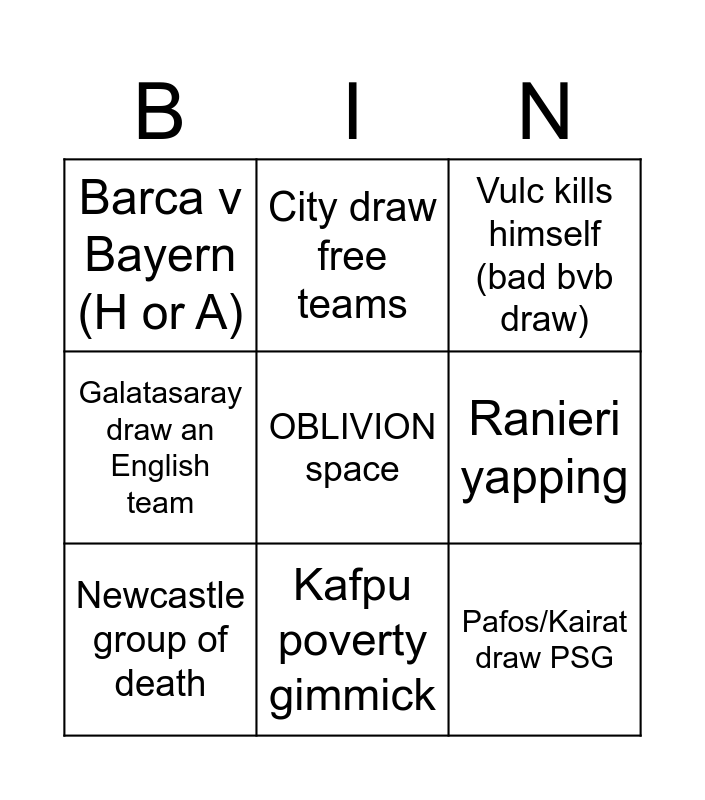 This bingo card has a free space and 8 words: Ranieri yapping, Vulc kills himself (bad bvb draw), City draw free teams, Newcastle group of death, Barca v Bayern (H or A), Pafos/Kairat draw PSG, Galatasaray draw an English team and Kafpu poverty gimmick.