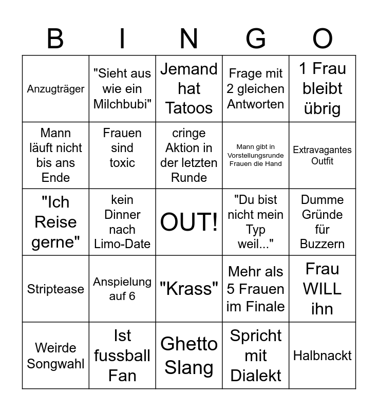 This bingo card has 37 words: Meine Frau/Freundin sollte..., Mann mit Lederjacke, Videomoment mit vielen Buzzern, Frauen sind toxic, Frau WILL ihn, Anspielung auf 6, cringe Aktion in der letzten Runde, Niemand drückt nach der Vorstellung, 1 Frau bleibt übrig, Ralf macht sich lustig, kein Dinner nach Limo-Date, Frage mit 2 gleichen Antworten, OUT!, Dumme Gründe für Buzzern, Mann läuft nicht bis ans Ende, Striptease, Buzzerwelle in Runde 1, Jemand hat Tatoos, "Krass", "Du bist nicht mein Typ weil...", Anzugträger, Extravagantes Outfit, Weirde Songwahl, Ghetto Slang, Ganz ganz weirdes Aktionsspiel im Studio, Spricht mit Dialekt, "Sieht aus wie ein Milchbubi", ganz wilde Friese, Mehr Schmuck als Haare, Ralf ist enttäuscht, Weirdes Hobby, Ist fussball Fan, "Ich Reise gerne", Halbnackt, Mehr als 5 Frauen im Finale, Mann gibt in Vorstellungsrunde Frauen die Hand and "Ich will einen Bad Boy".