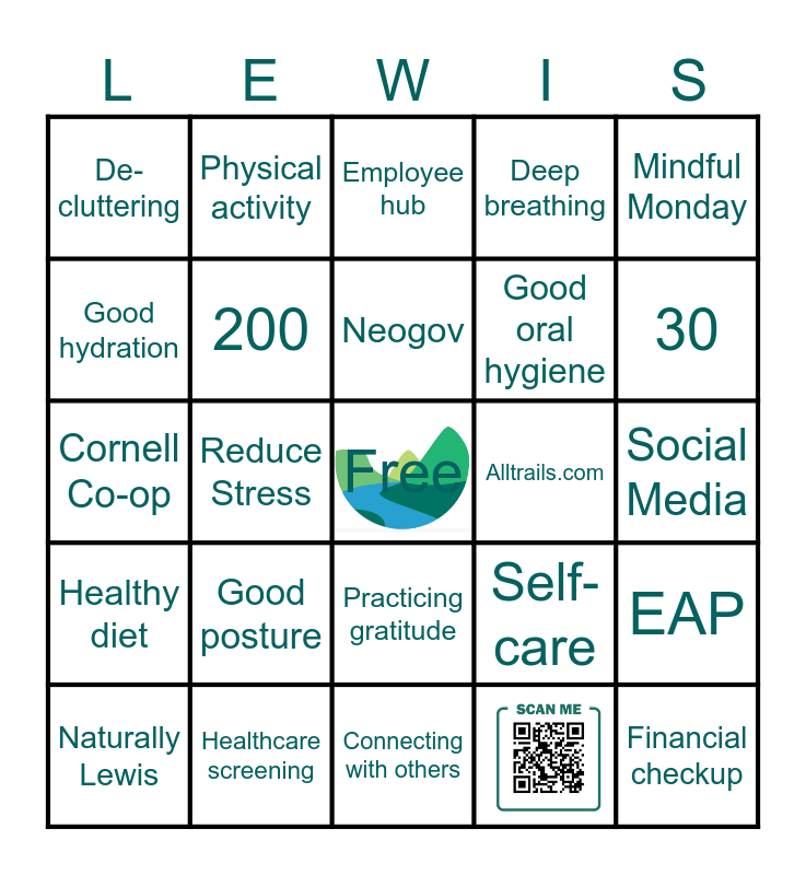 This bingo card has 1 images, a free space and 31 words: 8, Reduce Stress, 64, Healthy diet, 200, Mindful Monday, EAP, Physical activity, Discovertughill.com, Neogov, Employee hub, Weight Loss challenge, Work life balance, Alltrails.com, Lady LeWinde Milzalot, Naturally Lewis, Cornell Co-op, Practicing gratitude, Good posture, Self-care, Meditation, Social Media, Healthcare screening, Financial checkup, Deep breathing, Good oral hygiene, Good hydration, De-cluttering, Connecting with others, Immunizations and 30.