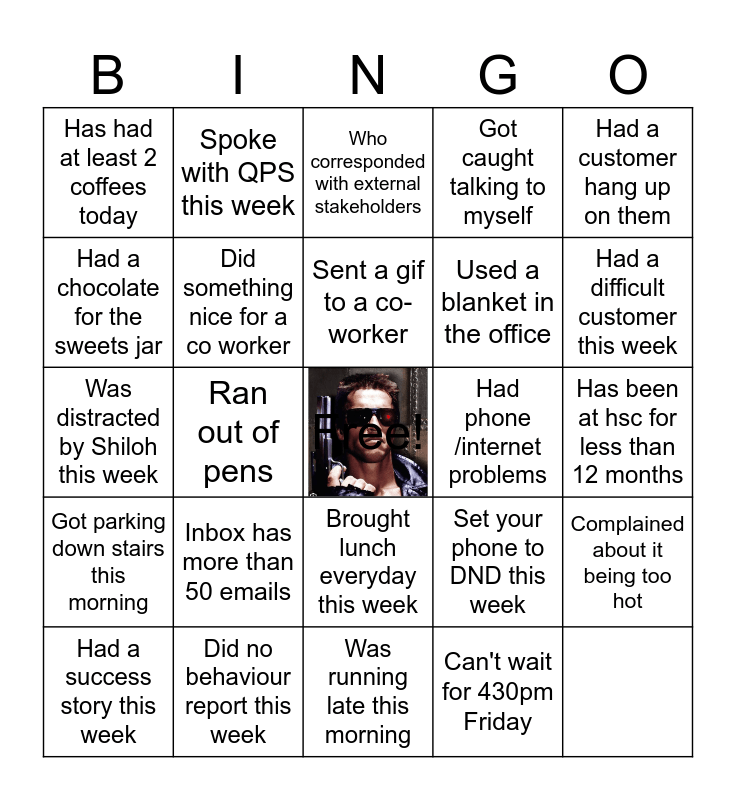 This bingo card has a free space and 24 words: Got parking down stairs this morning, Did no behaviour report this week, Brought lunch everyday this week, Set your phone to DND this week, Had a customer hang up on them, Has had at least 2 coffees today, Spoke with QPS this week, Who corresponded with external stakeholders, Used a blanket in the office, Complained about it being too hot, Had a chocolate for the sweets jar, Did something nice for a co worker, Got a parking ticket this year!, Had phone /internet problems, Had a difficult customer this week, Had a success story this week, Ran out of pens, Sent a gif to a co-worker, Got caught talking to myself, Has been at hsc for less than 12 months, Was distracted by Shiloh this week, Inbox has more than 50 emails, Was running late this morning and Can't wait for 430pm Friday.