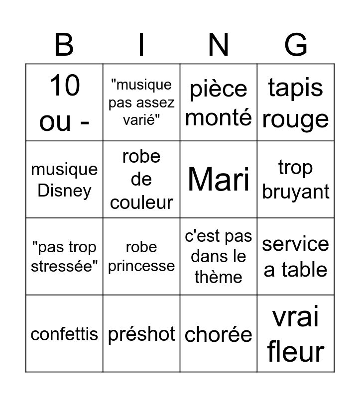 This bingo card has 16 words: préshot, service a table, pièce monté, 10 ou -, "pas trop stressée", "musique pas assez varié", c'est pas dans le thème, chorée, musique Disney, robe de couleur, confettis, tapis rouge, robe princesse, trop bruyant, Mari and vrai fleur.
