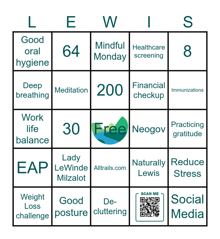 This bingo card has 1 images, a free space and 31 words: Self-care, 30, Good hydration, EAP, Meditation, 8, Reduce Stress, 64, Healthy diet, 200, Mindful Monday, Physical activity, Discovertughill.com, Neogov, Employee hub, Weight Loss challenge, Work life balance, Alltrails.com, Lady LeWinde Milzalot, Naturally Lewis, Cornell Co-op, Practicing gratitude, Good posture, Social Media, Healthcare screening, Financial checkup, Deep breathing, Good oral hygiene, De-cluttering, Connecting with others and Immunizations.