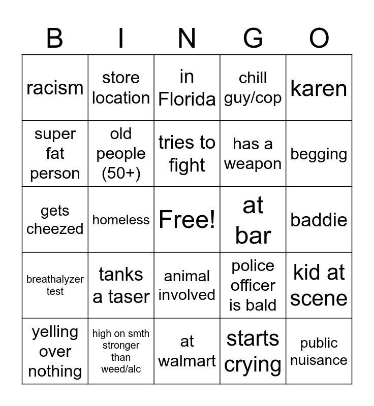 This bingo card has a free space and 24 words: tanks a taser, high on smth stronger than weed/alc, tries to fight, yelling over nothing, karen, racism, super fat person, store location, at bar, animal involved, has a weapon, gets cheezed, police officer is bald, kid at scene, old people (50+), starts crying, baddie, in Florida, begging, homeless, public nuisance, breathalyzer test, chill guy/cop and at walmart.