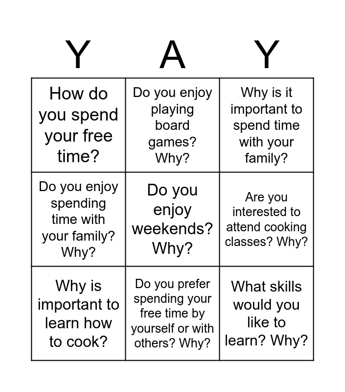 This bingo card has a free space and 8 words: Are you interested to attend cooking classes? Why?, Why is it important to spend time with your family?, Do you enjoy playing board games? Why?, Why is important to learn how to cook?, How do you spend your free time?, What skills would you like to learn? Why?, Do you enjoy spending time with your family? Why? and Do you prefer spending your free time by yourself or with others? Why?.