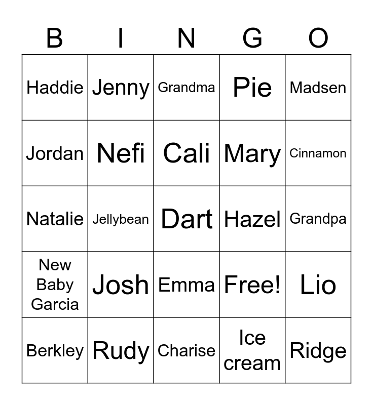 This bingo card has 25 words: Josh, Charise, Cali, Berkley, Madsen, Haddie, Jordan, Jenny, Hazel, Emma, Mary, Natalie, Free!, Lio, Nefi, Ridge, Grandpa, Grandma, Cinnamon, Jellybean, Dart, Rudy, New Baby Garcia, Pie and Ice cream.