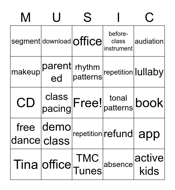 This bingo card has a free space and 24 words: demo class, office, rhythm patterns, Tina, audiation, segment, makeup, download, tonal patterns, repetition, repetition, CD, refund, app, parent ed, absence, book, office, lullaby, class pacing, active kids, free dance, before-class instrument and TMC Tunes.