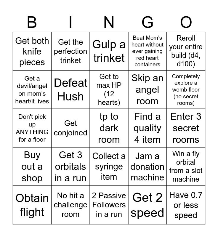 This bingo card has 50 words: get to an error room, tp to dark room, Get horns (characters cannot start with them; IE: eve, azazel), 2 Passive Followers in a run, Get 3 orbitals in a run, Get 6 Permanent Damage (no azazel), Get the perfection trinket, Beat Mom’s heart/it lives w/o shopping, Get a devil/angel on mom’s heart/it lives, Pay out a slot machine until it pays out/explodes, Defeat Hush, Beat Mom’s heart without ever gaining red heart containers, Win a fly orbital from a slot machine, Jam a donation machine, Revive (not as lazarus), Get an item from a non-tinted grid object, Get to max HP (12 hearts), Find a quality 4 item, Get Bookworm transformation, Reroll your entire build (d4, d100), Get conjoined, Get 2 speed, Get both knife pieces, Skip an angel room, Have 6+ red heart containers, Have 0.7 or less speed, Completely explore a womb floor (no secret rooms), Sleep in a bed, Gulp a trinket, Collect a syringe item, Kill a green champion enemy, Beat a floor boss with half a heart left, Win 2 runs, Clear a boss challenge room, No hit a challenge room, Have 1 item of every quality on T. Isaac, Use 2 reverse cards, Get 2 curses, Get a gold pickup, Enter 3 secret rooms, Beat a super mini-boss, Buy out a devil deal, Get an item from a bomb, charge, or rotten beggar, Enter a planetarium, Obtain flight, Don't pick up ANYTHING for a floor, Beat a boss in under a minute, Beat boss rush, Buy out a shop and Get an item with “head” in its name.