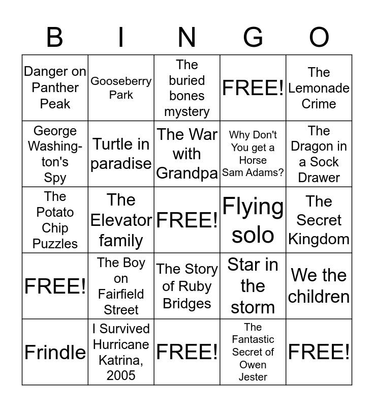 This bingo card has a free space and 24 words: The Boy on Fairfield Street, I Survived Hurricane Katrina, 2005, The War with Grandpa, Frindle, The Lemonade Crime, Danger on Panther Peak, George Washing-ton's Spy, Gooseberry Park, Flying solo, The Story of Ruby Bridges, Why Don't You get a Horse Sam Adams?, The Potato Chip Puzzles, Star in the storm, We the children, Turtle in paradise, The Fantastic Secret of Owen Jester, The Secret Kingdom, The buried bones mystery, The Dragon in a Sock Drawer, The Elevator family, FREE!, FREE!, FREE! and FREE!.