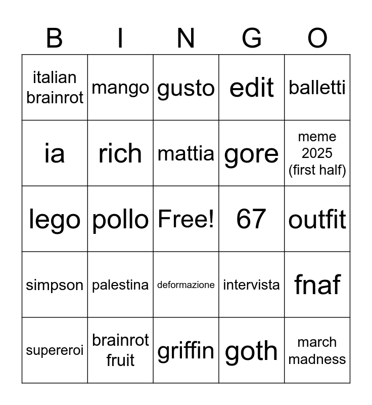 This bingo card has a free space and 24 words: palestina, brainrot fruit, mattia, supereroi, balletti, italian brainrot, ia, mango, 67, deformazione, gore, lego, intervista, fnaf, rich, goth, outfit, gusto, meme 2025 (first half), pollo, march madness, simpson, edit and griffin.
