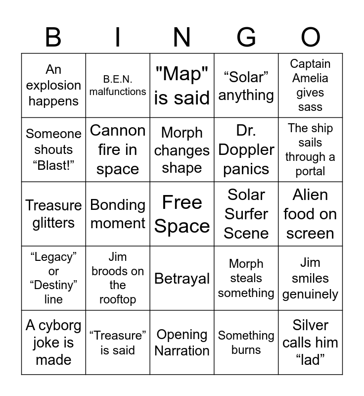 This bingo card has a free space and 24 words: Jim broods on the rooftop, “Treasure” is said, Morph changes shape, A cyborg joke is made, Captain Amelia gives sass, An explosion happens, Someone shouts “Blast!”, B.E.N. malfunctions, Solar Surfer Scene, Betrayal, Dr. Doppler panics, Treasure glitters, Morph steals something, Jim smiles genuinely, Cannon fire in space, Something burns, Alien food on screen, "Map" is said, The ship sails through a portal, Bonding moment, Silver calls him “lad”, “Legacy” or “Destiny” line, “Solar” anything and Opening Narration.
