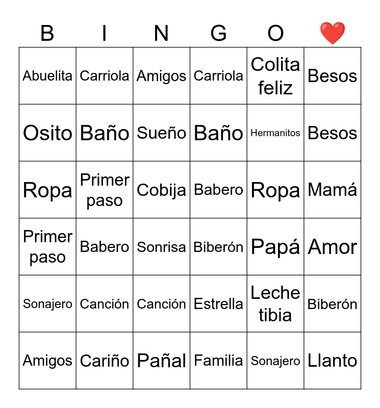 ⚠ This card has duplicate items: Pañal (2), Biberón (2), Cuna (2), Babero (2), Sonajero (2), Chupón (2), Osito (2), Nana (2), Sueño (2), Cobija (2), Carriola (2), Juguete (2), Besos (2), Canción (2), Hermanitos (2), Abuelita (2), Ropa (2), Colita feliz (2), Familia (2), Baño (2), Primer paso (2), Amigos (2), Sonrisa (2), Amor (2), Manta (2)