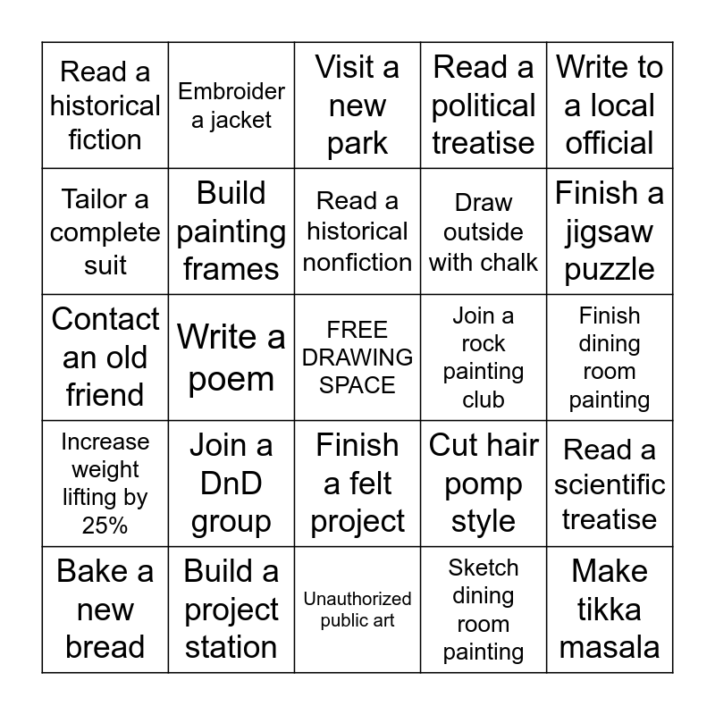 This bingo card has a free space and 24 words: Join a DnD group, Build a project station, Read a historical nonfiction, Bake a new bread, Write to a local official, Read a historical fiction, Tailor a complete suit, Embroider a jacket, Join a rock painting club, Finish a felt project, Draw outside with chalk, Contact an old friend, Cut hair pomp style, Read a scientific treatise, Build painting frames, Sketch dining room painting, Finish dining room painting, Visit a new park, Finish a jigsaw puzzle, Write a poem, Make tikka masala, Increase weight lifting by 25%, Read a political treatise and Unauthorized public art.