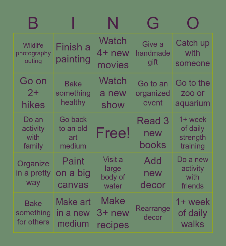 This bingo card has a free space and 24 words: Paint on a big canvas, Make art in a new medium, Watch a new show, Bake something for others, Catch up with someone, Wildlife photography outing, Go on 2+ hikes, Finish a painting, Read 3 new books, Visit a large body of water, Go to an organized event, Do an activity with family, Add new decor, Do a new activity with friends, Bake something healthy, Rearrange decor, 1+ week of daily strength training, Watch 4+ new movies, Go to the zoo or aquarium, Go back to an old art medium, 1+ week of daily walks, Organize in a pretty way, Give a handmade gift and Make 3+ new recipes.