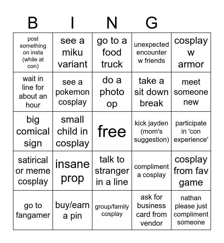 This bingo card has a free space and 24 words: insane prop, buy/earn a pin, do a photo op, go to fangamer, cosplay w armor, post something on insta (while at con), wait in line for about an hour, see a miku variant, kick jayden (mom's suggestion), talk to stranger in a line, take a sit down break, big comical sign, compliment a cosplay, cosplay from fav game, see a pokemon cosplay, ask for business card from vendor, participate in 'con experience', go to a food truck, meet someone new, small child in cosplay, nathan please just compliment someone, satirical or meme cosplay, unexpected encounter w friends and group/family cosplay.