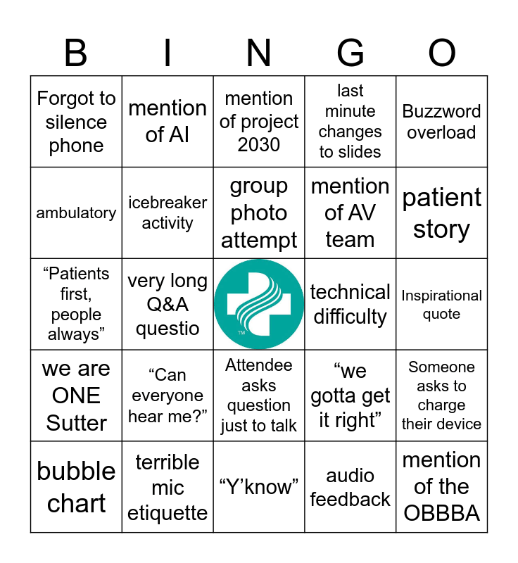 This bingo card has a free space and 27 words: “we gotta get it right”, mention of Kaiser, mention of AV team, “Y’know”, ambulatory, mention of project 2030, mention of AI, we are ONE Sutter, technical difficulty, Someone asks to charge their device, “Patients first, people always”, last minute changes to slides, bubble chart, terrible mic etiquette, patient story, “we want to be better than…”, icebreaker activity, group photo attempt, “Can everyone hear me?”, Forgot to silence phone, Inspirational quote, audio feedback, very long Q&A questio, mention of the OBBBA, Attendee asks question just to talk, Buzzword overload and Poll.