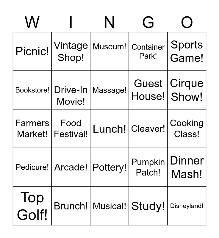 This bingo card has a free space and 24 words: Arcade!, Brunch!, Massage!, Top Golf!, Sports Game!, Picnic!, Bookstore!, Vintage Shop!, Cleaver!, Pottery!, Guest House!, Farmers Market!, Pumpkin Patch!, Dinner Mash!, Drive-In Movie!, Study!, Cooking Class!, Museum!, Cirque Show!, Food Festival!, Disneyland!, Pedicure!, Container Park! and Musical!.