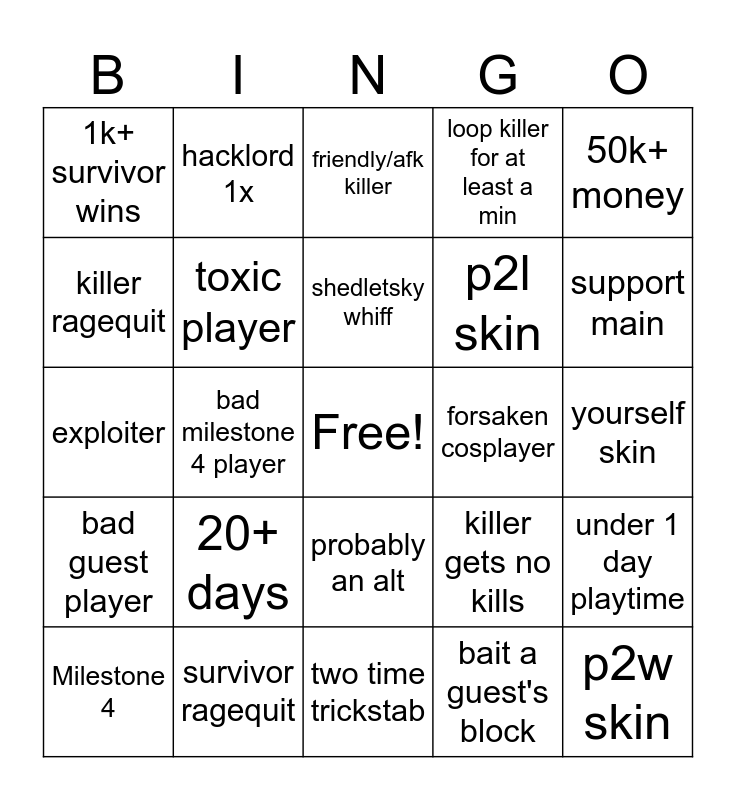 This bingo card has a free space and 24 words: Milestone 4, 20+ days, shedletsky whiff, bait a guest's block, 50k+ money, 1k+ survivor wins, hacklord 1x, friendly/afk killer, forsaken cosplayer, yourself skin, exploiter, toxic player, killer gets no kills, under 1 day playtime, killer ragequit, survivor ragequit, two time trickstab, loop killer for at least a min, support main, bad guest player, bad milestone 4 player, probably an alt, p2l skin and p2w skin.