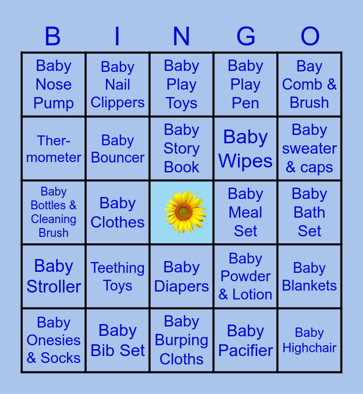 This bingo card has a free space and 24 words: Teething Toys, Baby Bib Set, Baby Story Book, Baby Onesies & Socks, Bay Comb & Brush, Baby Nose Pump, Ther- mometer, Baby Nail Clippers, Baby Meal Set, Baby Diapers, Baby Wipes, Baby Bottles & Cleaning Brush, Baby Powder & Lotion, Baby Blankets, Baby Bouncer, Baby Pacifier, Baby Bath Set, Baby Play Toys, Baby sweater & caps, Baby Clothes, Baby Highchair, Baby Stroller, Baby Play Pen and Baby Burping Cloths.