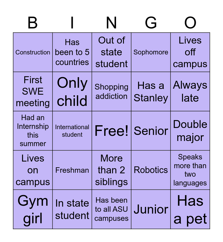 This bingo card has a free space and 24 words: Freshman, In state student, Shopping addiction, Gym girl, Lives off campus, Construction, First SWE meeting, Has been to 5 countries, Senior, More than 2 siblings, Has a Stanley, Had an Internship this summer, Robotics, Speaks more than two languages, Only child, Junior, Double major, Out of state student, Always late, International student, Has a pet, Lives on campus, Sophomore and Has been to all ASU campuses.