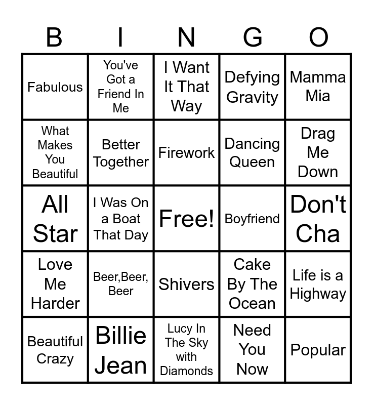 This bingo card has a free space and 26 words: Shivers, Need You Now, Firework, Billie Jean, Mamma Mia, Fabulous, What Makes You Beautiful, You've Got a Friend In Me, Don't Cha, Cake By The Ocean, Dancing Queen, All Star, Life is a Highway, Beautiful Crazy, I Was On a Boat That Day, The Way, Defying Gravity, Love Me Harder, I Want It That Way, Popular, Drag Me Down, Lucy In The Sky with Diamonds, Boyfriend, Beer,Beer, Beer, Better Together and Marry You.