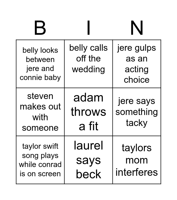 This bingo card has 9 words: taylor swift song plays while conrad is on screen, jere gulps as an acting choice, belly calls off the wedding, steven makes out with someone, belly looks between jere and connie baby, jere says something tacky, adam throws a fit, taylors mom interferes and laurel says beck.