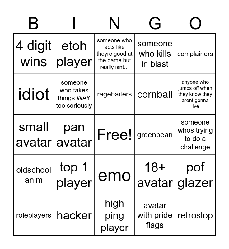 This bingo card has a free space and 24 words: top 1 player, hacker, ragebaiters, roleplayers, complainers, 4 digit wins, idiot, etoh player, greenbean, emo, cornball, small avatar, 18+ avatar, pof glazer, someone who takes things WAY too seriously, avatar with pride flags, someone whos trying to do a challenge, someone who acts like theyre good at the game but really isnt..., anyone who jumps off when they know they arent gonna live, pan avatar, retroslop, oldschool anim, someone who kills in blast and high ping player.