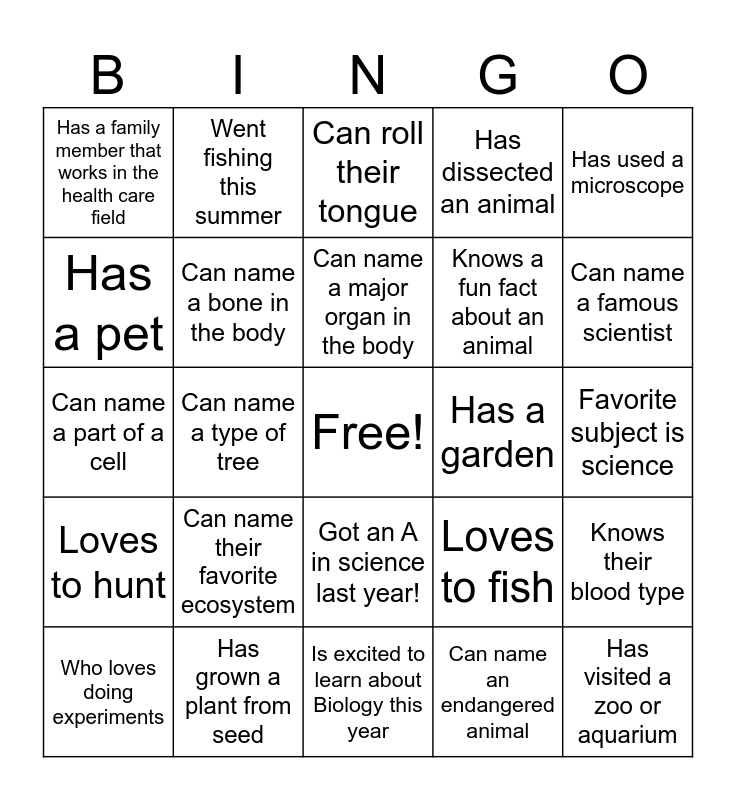 This bingo card has a free space and 24 words: Can name their favorite ecosystem, Has grown a plant from seed, Can name a major organ in the body, Who loves doing experiments, Has used a microscope, Has a family member that works in the health care field, Has a pet, Went fishing this summer, Has a garden, Got an A in science last year!, Knows a fun fact about an animal, Can name a part of a cell, Loves to fish, Knows their blood type, Can name a bone in the body, Can name an endangered animal, Favorite subject is science, Can roll their tongue, Can name a famous scientist, Can name a type of tree, Has visited a zoo or aquarium, Loves to hunt, Has dissected an animal and Is excited to learn about Biology this year.