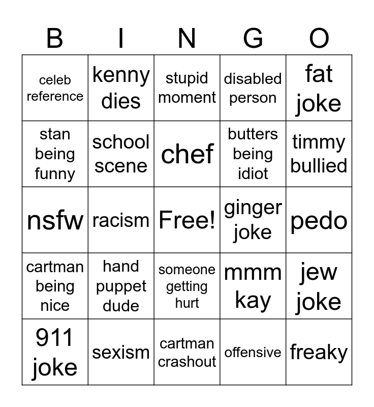 This bingo card has a free space and 24 words: hand puppet dude, sexism, chef, 911 joke, fat joke, celeb reference, stan being funny, kenny dies, ginger joke, someone getting hurt, butters being idiot, nsfw, mmm kay, jew joke, school scene, offensive, pedo, stupid moment, timmy bullied, racism, freaky, cartman being nice, disabled person and cartman crashout.