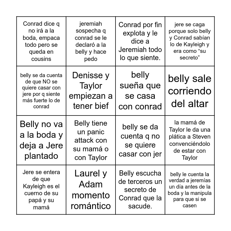 This bingo card has 36 words: Belly le cuenta todo lo que le dijo conrad a taylor, Conrad le dice a belly q fue puro pedo, Steven y Denisse se besan, belly sueña que se casa con conrad, taylor se pelea con conrad, belly le cuenta la verdad a jeremías un día antes de la boda y la manipula para que si se casen, belly sale corriendo del altar, La boda que se ve en el trailer de belly con las flores es un wedding rehearsal, belly se da cuenta de que NO se quiere casar con jere por q siente más fuerte lo de conrad, Taylor se la arma a conrad porque belly le conto lo que paso, la mamá de Taylor le da una plática a Steven convenciéndolo de estar con Taylor, jere se caga porque solo belly y Conrad sabían lo de Kayleigh y era como “su secreto”, Jeremiah se la arma de pedo a belly porque ve como se ven ella y conrad, Laurel y Adam momento romántico, Belly tiene un panic attack con su mamá o con Taylor, Conrad dice q no irá a la boda, empaca todo pero se queda en cousins, Taylor y Steven tienen un momento de tensión pero no pasa nada, Steven le dice a Denise que no está listo para una relación o se besan, Jere se entera de que Kayleigh es el cuerno de su papá y su mamá, Conrad por fin explota y le dice a Jeremiah todo lo que siente., Belly escucha de terceros un secreto de Conrad que la sacude., Jeremiah se pone celoso heavy y arma una escena incómoda., Conrad y Belly tienen un momento de tensión que casi termina en beso., El episodio cierra con una pelea fuerte entre los dos hermanos., steven y denisse no se besan, jeremiah sospecha q conrad se le declaró a la belly y hace pedo, belly se da cuenta q no se quiere casar con jer, jer y conrad se pelean y se meten putazos, Belly no va a la boda y deja a Jere plantado, Denisse y Taylor empiezan a tener bief, Conrad encuentra una carta o alguito de su mamá en donde dice que Belly es el amor de su vida e intenta detener la boda, el cap termina jer super heartbroken, Conrad se va de cousins, Belly le confiesa a Taylor lo que le dijo Conrad y dice que siente lo mismo, Steven se da cuenta que still tiene feelings hacia Taylor and Call off the wedding.