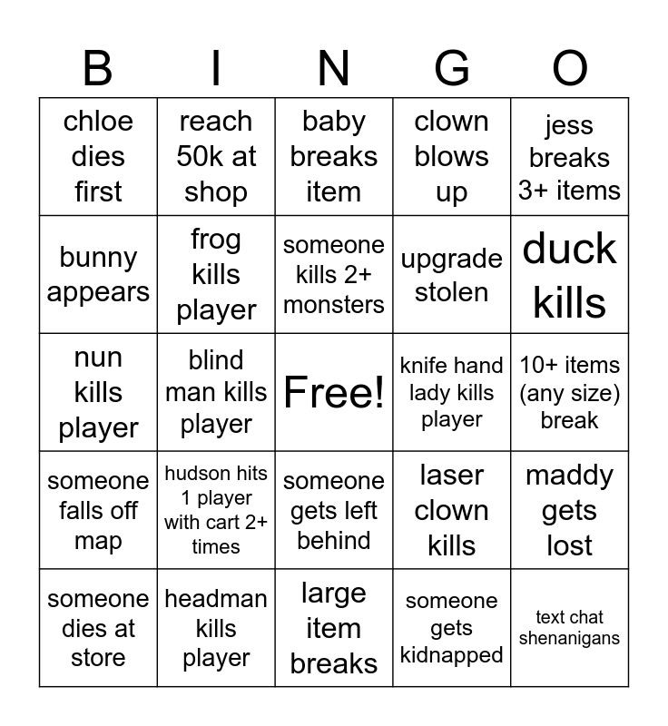 This bingo card has a free space and 24 words: hudson hits 1 player with cart 2+ times, headman kills player, someone kills 2+ monsters, someone dies at store, jess breaks 3+ items, chloe dies first, bunny appears, reach 50k at shop, knife hand lady kills player, someone gets left behind, upgrade stolen, nun kills player, laser clown kills, maddy gets lost, frog kills player, someone gets kidnapped, 10+ items (any size) break, baby breaks item, duck kills, blind man kills player, text chat shenanigans, someone falls off map, clown blows up and large item breaks.