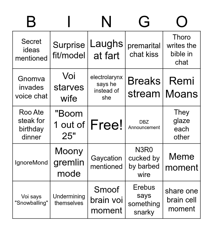This bingo card has a free space and 24 words: Moony gremlin mode, Undermining themselves, electrolarynx says he instead of she, Voi says "Snowballing", Thoro writes the bible in chat, Secret ideas mentioned, Gnomva invades voice chat, Surprise fit/model, DBZ Announcement, Gaycation mentioned, Breaks stream, Roo Ate steak for birthday dinner, N3R0 cucked by by barbed wire, Meme moment, Voi starves wife, Erebus says something snarky, They glaze each other, Laughs at fart, Remi Moans, "Boom 1 out of 25", share one brain cell moment, IgnoreMond, premarital chat kiss and Smoof brain voi moment.