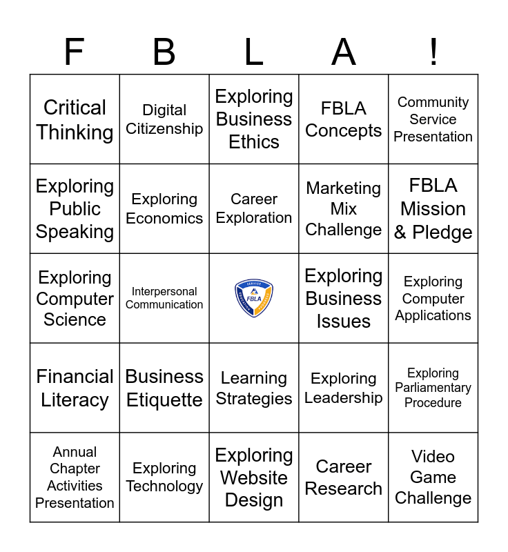 This bingo card has a free space and 24 words: Annual Chapter Activities Presentation, Business Etiquette, Career Exploration, Career Research, Community Service Presentation, Critical Thinking, Digital Citizenship, Exploring Business Ethics, Exploring Business Issues, Exploring Computer Applications, Exploring Computer Science, Exploring Economics, Exploring Leadership, Exploring Parliamentary Procedure, Exploring Public Speaking, Exploring Technology, Exploring Website Design, FBLA Concepts, FBLA Mission & Pledge, Financial Literacy, Interpersonal Communication, Learning Strategies, Marketing Mix Challenge and Video Game Challenge.