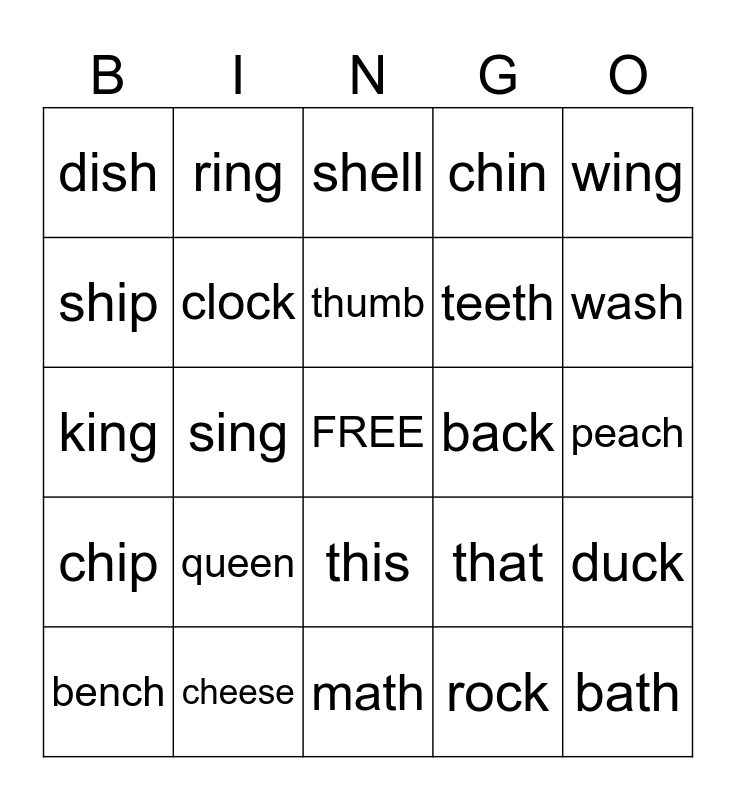 This bingo card has a free space and 32 words: rock, long, sing, quest, chip, clock, wing, duck, ring, quiz, thumb, shell, chat, chop, back, quack, bench, king, this, queen, that, kick, peach, cheese, bath, chin, teeth, ship, dish, math, shop and wash.