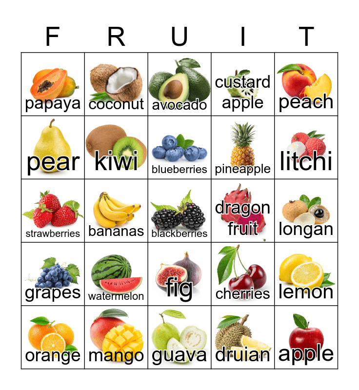 This bingo card has 25 images and 25 words: watermelon, guava, blueberries, orange, peach, papaya, pear, coconut, dragon fruit, fig, pineapple, strawberries, cherries, lemon, kiwi, apple, longan, avocado, litchi, bananas, blackberries, mango, grapes, custard apple and druian.
