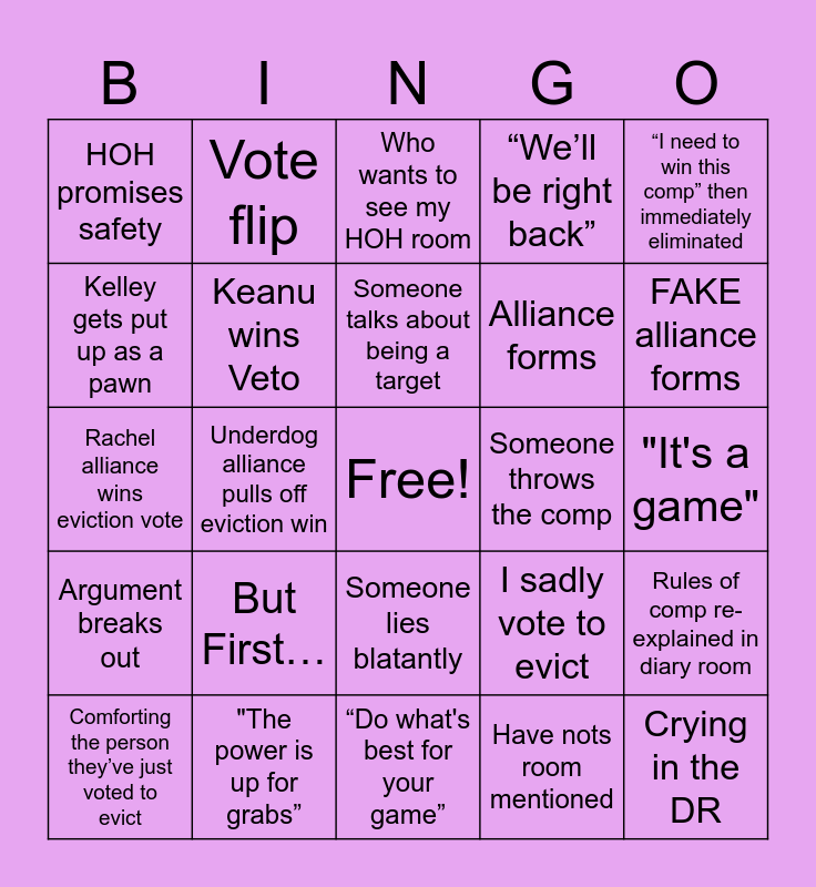 This bingo card has a free space and 24 words: Comforting the person they’ve just voted to evict, But First…, Someone talks about being a target, Have nots room mentioned, “I need to win this comp” then immediately eliminated, HOH promises safety, Vote flip, Who wants to see my HOH room, Someone throws the comp, "It's a game", Rachel alliance wins eviction vote, Keanu wins Veto, I sadly vote to evict, Rules of comp re-explained in diary room, Kelley gets put up as a pawn, "The power is up for grabs”, “Do what's best for your game”, “We’ll be right back”, FAKE alliance forms, Argument breaks out, Underdog alliance pulls off eviction win, Someone lies blatantly, Alliance forms and Crying in the DR.