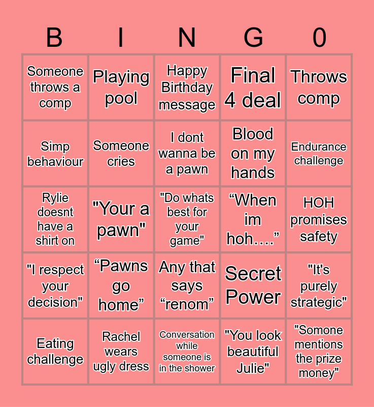 This bingo card has a free space and 40 words: Ava makes a dumb face, Rylie doesnt have a shirt on, "Who wants to see my HOH room", Someone cries, Rachel wears ugly dress, Any that says “renom”, I dont wanna be a pawn, "Let's Go", Throws comp, "I respect your decision", "Your a pawn", Final 4 deal, "Somone mentions the prize money", HOH promises safety, “When im hoh….”, “Pawns go home”, Celebrating in the pantry, Someone throws a comp, “Its a game”, Happy Birthday message, "It's purely strategic", "You look beautiful Julie", Blood on my hands, Simp behaviour, "Iam not going to put you on the block", Showmance mentioned, Someone walk in on game talk, ZINGBOT, Live feed glitch, OTEV comp, Costume punishment, Eating challenge, Julie tells everyone to gather in the living room, Secret Power, Endurance challenge, Conversation while someone is in the shower, Tells a sad story, Deal made during a comp, Playing pool and Alliance splits up.