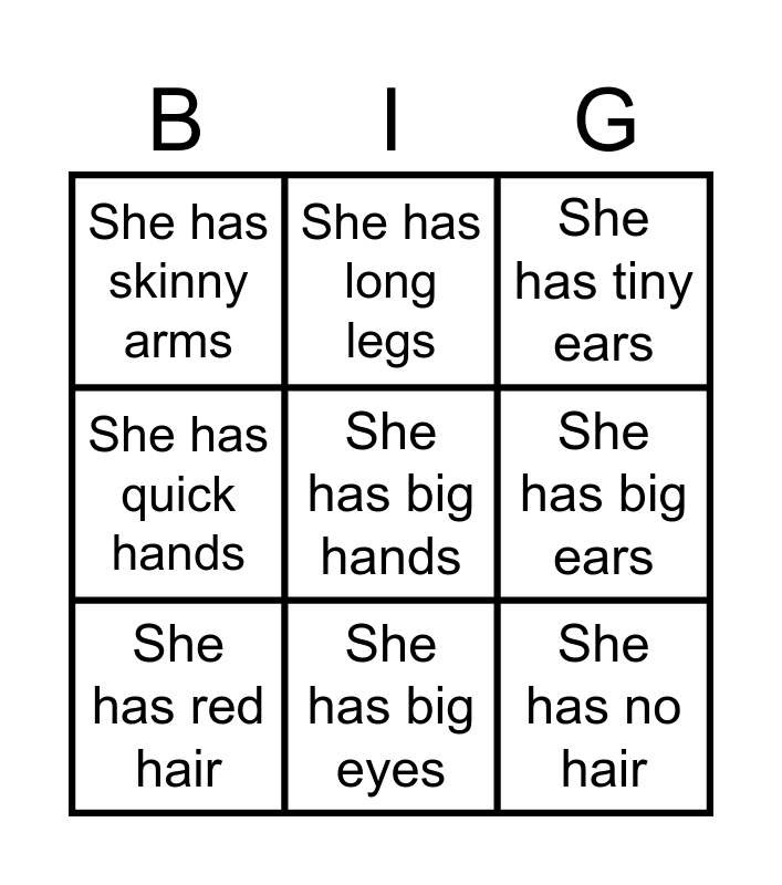 This bingo card has a free space and 8 words: She has quick hands, She has long legs, She has big ears, She has red hair, She has tiny ears, She has skinny arms, She has big eyes and She has no hair.