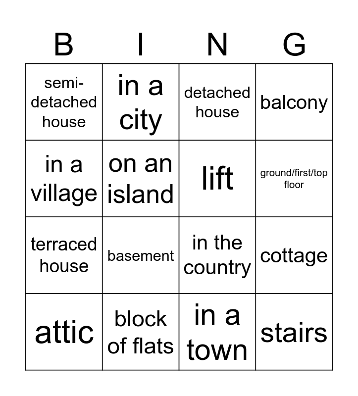 This bingo card has 16 words: block of flats, cottage, detached house, semi-detached house, terraced house, in a city, in the country, in a town, in a village, on an island, attic, balcony, basement, ground/first/top floor, lift and stairs.