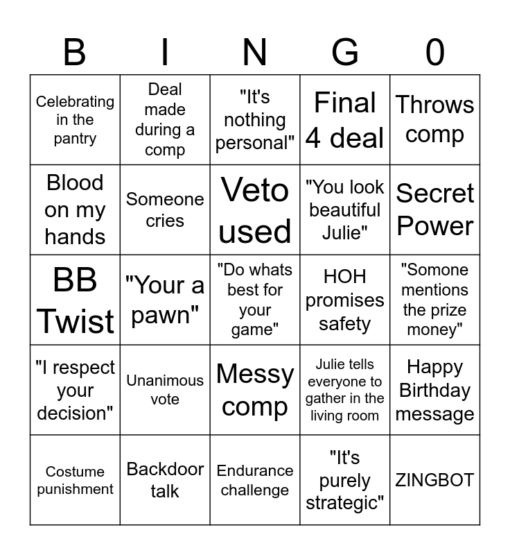 This bingo card has 40 words: Lies about career, BB Twist, "Who wants to see my HOH room", Someone cries, Backdoor talk, Messy comp, Veto used, "Let's Go", Throws comp, "I respect your decision", "Your a pawn", Final 4 deal, "Do whats best for your game", "Somone mentions the prize money", HOH promises safety, Unanimous vote, Timed out on challenge, Celebrating in the pantry, Someone throws a comp, "It's nothing personal", Happy Birthday message, "It's purely strategic", "You look beautiful Julie", Blood on my hands, House guest choice in Veto comp, "Iam not going to put you on the block", Showmance mentioned, Someone walk in on game talk, ZINGBOT, Live feed glitch, OTEV comp, Costume punishment, Eating challenge, Julie tells everyone to gather in the living room, Secret Power, Endurance challenge, Conversation while someone is in the shower, Tells a sad story, Deal made during a comp and Playing pool.