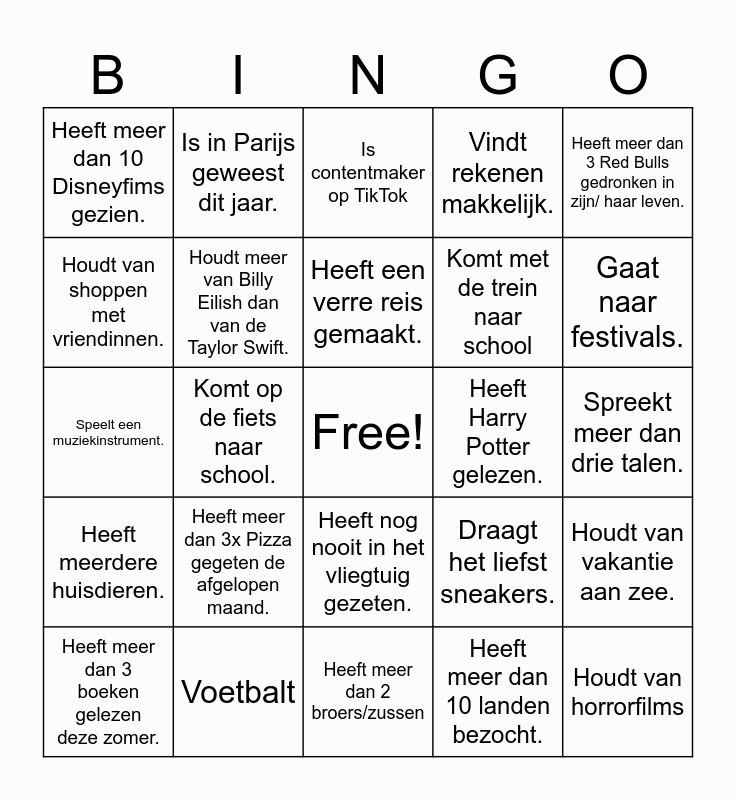 This bingo card has a free space and 24 words: Heeft meer dan 3 boeken gelezen deze zomer., Heeft meer dan 3x Pizza gegeten de afgelopen maand., Heeft een verre reis gemaakt., Heeft meer dan 10 landen bezocht., Heeft meer dan 3 Red Bulls gedronken in zijn/ haar leven., Heeft meer dan 10 Disneyfims gezien., Is in Parijs geweest dit jaar., Is contentmaker op TikTok, Heeft Harry Potter gelezen., Spreekt meer dan drie talen., Speelt een muziekinstrument., Houdt meer van Billy Eilish dan van de Taylor Swift., Draagt het liefst sneakers., Houdt van vakantie aan zee., Houdt van shoppen met vriendinnen., Voetbalt, Heeft meer dan 2 broers/zussen, Vindt rekenen makkelijk., Gaat naar festivals., Heeft meerdere huisdieren., Komt op de fiets naar school., Heeft nog nooit in het vliegtuig gezeten., Komt met de trein naar school and Houdt van horrorfilms.