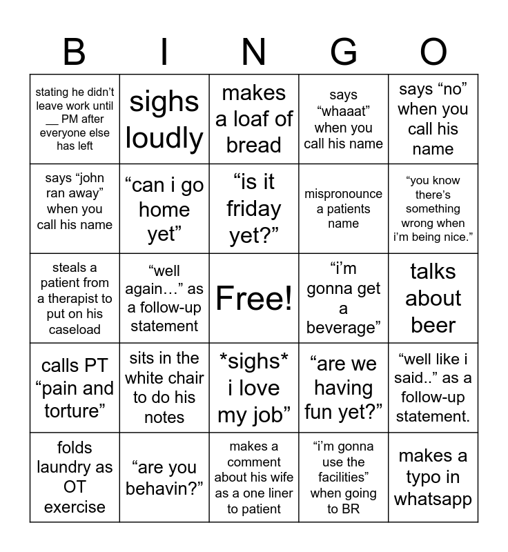This bingo card has a free space and 29 words: folds laundry as OT exercise, states staff on floors aren’t the brightest, “well again…” as a follow-up statement, moves furniture to make his own work area, stating he didn’t leave work until __ PM after everyone else has left, makes a loaf of bread, “can i go home yet”, sits in the white chair to do his notes, “i’m gonna get a beverage”, “are you behavin?”, talks about beer, makes a typo in whatsapp, makes a comment about his wife as a one liner to patient, “i’m gonna use the facilities” when going to BR, “you know there’s something wrong when i’m being nice.”, gives a shoulder/back massage, *sighs* i love my job”, calls PT “pain and torture”, says “no” when you call his name, steals a patient from a therapist to put on his caseload, “are we having fun yet?”, fits someone in a wheelchair that isn’t his patient, mispronounce a patients name, says “john ran away” when you call his name, says “whaaat” when you call his name, sighs loudly, “well like i said..” as a follow-up statement., “is it friday yet?” and talks about BJs.