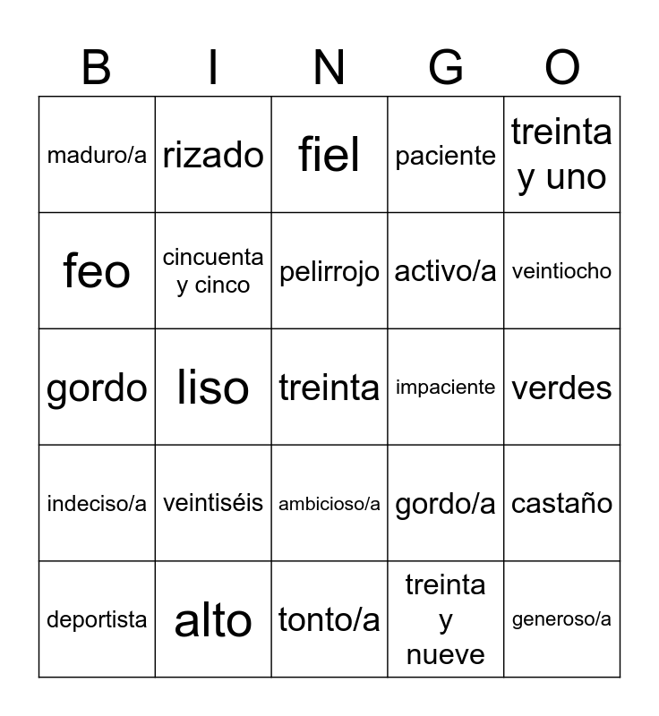 This bingo card has 145 words: alto/a, bajo/a, pequeño/a, grande, delgado/a, gordo/a, flaco/a, gordito/a, guapo/a, feo/a, atractivo/a, rubio/a, Free!, moreno/a, pelirrojo/a, calvo/a, pecoso/a, de talla/estatura mediana, rubio, moreno, negro, castaño, pelirrojo, largo, corto, liso, rizado, ondulado, bigote, barba, gafas, azules, marrones, verdes, grises, negros, abierto/a, aburrido/a, activo/a, agradable, alegre, amable, ambicioso/a, amistoso/a, antisociable, antipático/a, atento/a, cariñoso/a, comprensivo/a, considerado/a, contento/a, creativo/a, deportista, desagradable, desordenado/a, divertido/a, educado/a, egoísta, estudioso/a, extrovertido/a, fiel, generoso/a, hablador/a, honesto/a, imaginativo/a, impaciente, indeciso/a, inteligente, interesante, introvertido/a, leal, loco/a, maduro/a, maleducado/a, mentiroso/a, mimado/a, obstinado/a, optimista, organizado/a, paciente, perezoso/a, pesimista, responsable, serio/a, severo/a, simpático/a, sincero/a, sociable, tímido/a, tonto/a, trabajador/a, tranquilo/a, triste, valiente, alto, bajo, delgado, flaco, gordo, bonito, guapo, feo, pequeño, rubio, moreno, pelirrojo, veintiuno, veintidós, veintitrés, veinticuatro, veinticinco, veintiséis, veintisiete, veintiocho, veintinueve, treinta, treinta y uno, treinta y dos, treinta y tres, treinta y cuatro, treinta y cinco, treinta y seis, treinta y siete, treinta y ocho, treinta y nueve, cuarenta, cuarenta y uno, cuarenta y dos, cuarenta y tres, cuarenta y cuatro, cuarenta y cinco, cuarenta y seis, cuarenta y siete, cuarenta y ocho, cuarenta y nueve, cincuenta, cincuenta y uno, cincuenta y dos, cincuenta y tres, cincuenta y cuatro, cincuenta y cinco, cincuenta y seis, cincuenta y siete, cincuenta y ocho and cincuenta y nueve.