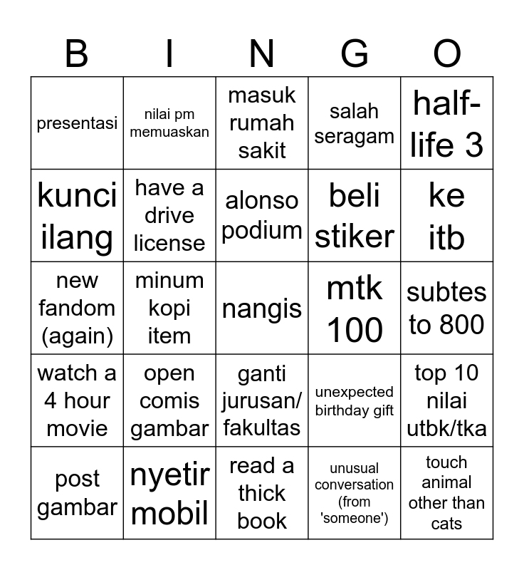 This bingo card has a free space and 24 words: open comis gambar, nyetir mobil, alonso podium, post gambar, half-life 3, presentasi, kunci ilang, nilai pm memuaskan, mtk 100, ganti jurusan/ fakultas, beli stiker, new fandom (again), unexpected birthday gift, top 10 nilai utbk/tka, have a drive license, unusual conversation (from 'someone'), subtes to 800, masuk rumah sakit, ke itb, minum kopi item, touch animal other than cats, watch a 4 hour movie, salah seragam and read a thick book.