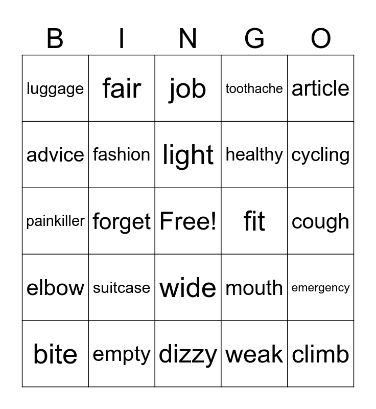 This bingo card has a free space and 26 words: wide, weak, light, empty, article, luggage, advice, fair, cough, mouth, healthy, painkiller, emergency, bite, forget, prescription, toothache, elbow, job, climb, cycling, dizzy, fit, suitcase, fashion and rent.