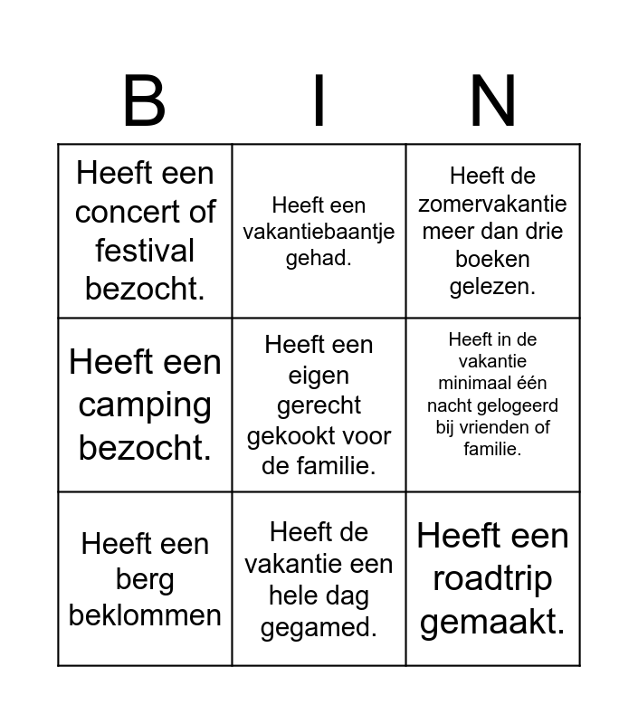 This bingo card has 18 words: Heeft deze zomer een pretpark bezocht., Is in de vakantie naar het buitenland gegaan., Heeft de zomervakantie meer dan drie boeken gelezen., Heeft een concert of festival bezocht., Heeft deze zomer een nieuwe sport of hobby geleerd., Heeft een camping bezocht., Heeft een museum bezocht., Heeft een vakantiebaantje gehad., Heeft de vakantie een hele dag gegamed., Heeft een roadtrip gemaakt., Heeft een nieuwe serie ontdekt., Heeft een eigen gerecht gekookt voor de familie., Heeft een dierentuin bezocht., Heeft in de vakantie minimaal één nacht gelogeerd bij vrienden of familie., Heeft een berg beklommen, Is deze vakantie in Nederland gebleven, Heeft deze zomer minimaal één keer de hele dag in bed gelegen. and Heeft deze vakantie minimaal 2x gezwommen.